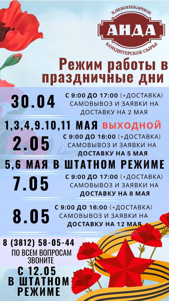 Уважаемые клиенты и партнёры! Поздравляем вас с наступающими весенними праздниками! В связи с праздничными днями сообщаем график работы компании «АНДА»