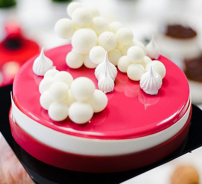 9. Торт муссовый «Вишня-миндаль» - Муссовый торт со вкусом вишни и ярким ароматом Амаретто. В основе масляный бисквит с добавлением молотого миндаля. Вишневый мусс с ягодной прослойкой вишни. Покрыт зеркальным гелем. Изящный декор из белого шоколада и коктейльной вишни.